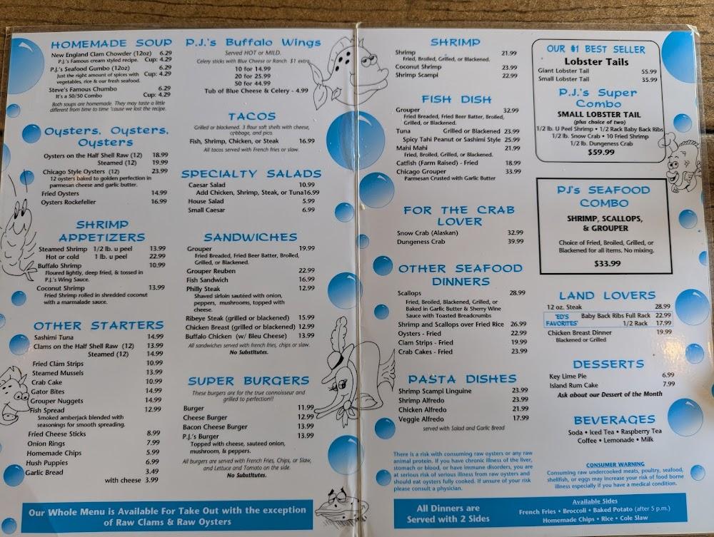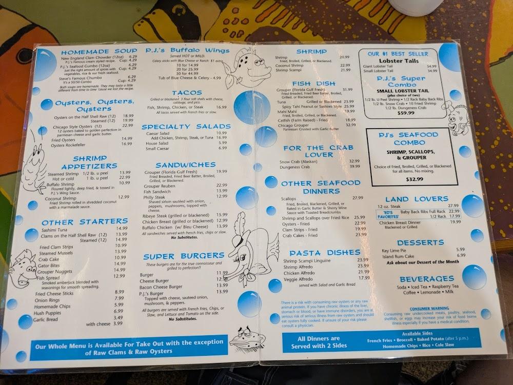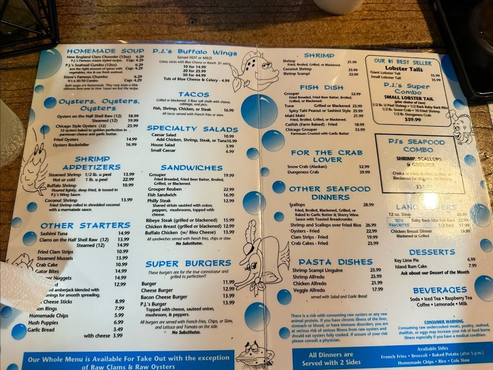 The menu at P.J.'s Oyster Bar leans heavily into seafood, featuring items like oysters on the half shell, shrimp dishes, and a variety of fried options. Highlights include award-winning clam chowder, seafood gumbo, and their famous lobsters.
